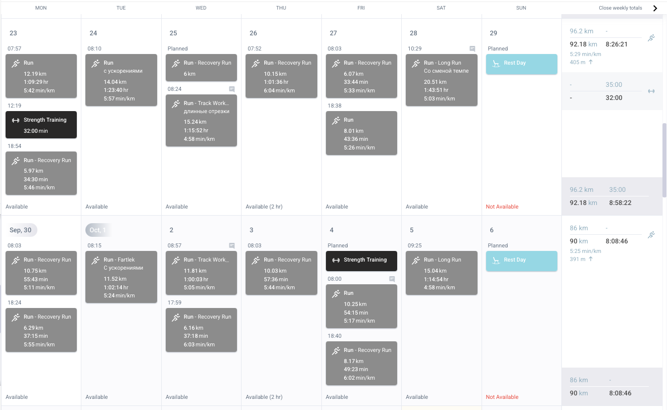 - Микропланирование: Каждое воскресенье вы получаете детальный план на следующую неделю в FinalSurge. В нём расписан каждый день, включая дни отдыха — они так же важны, как и тренировки.